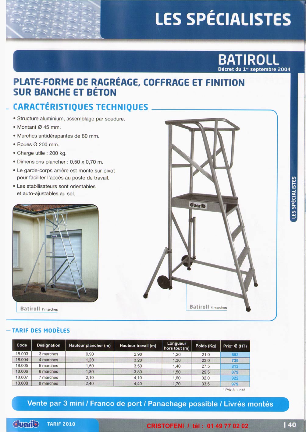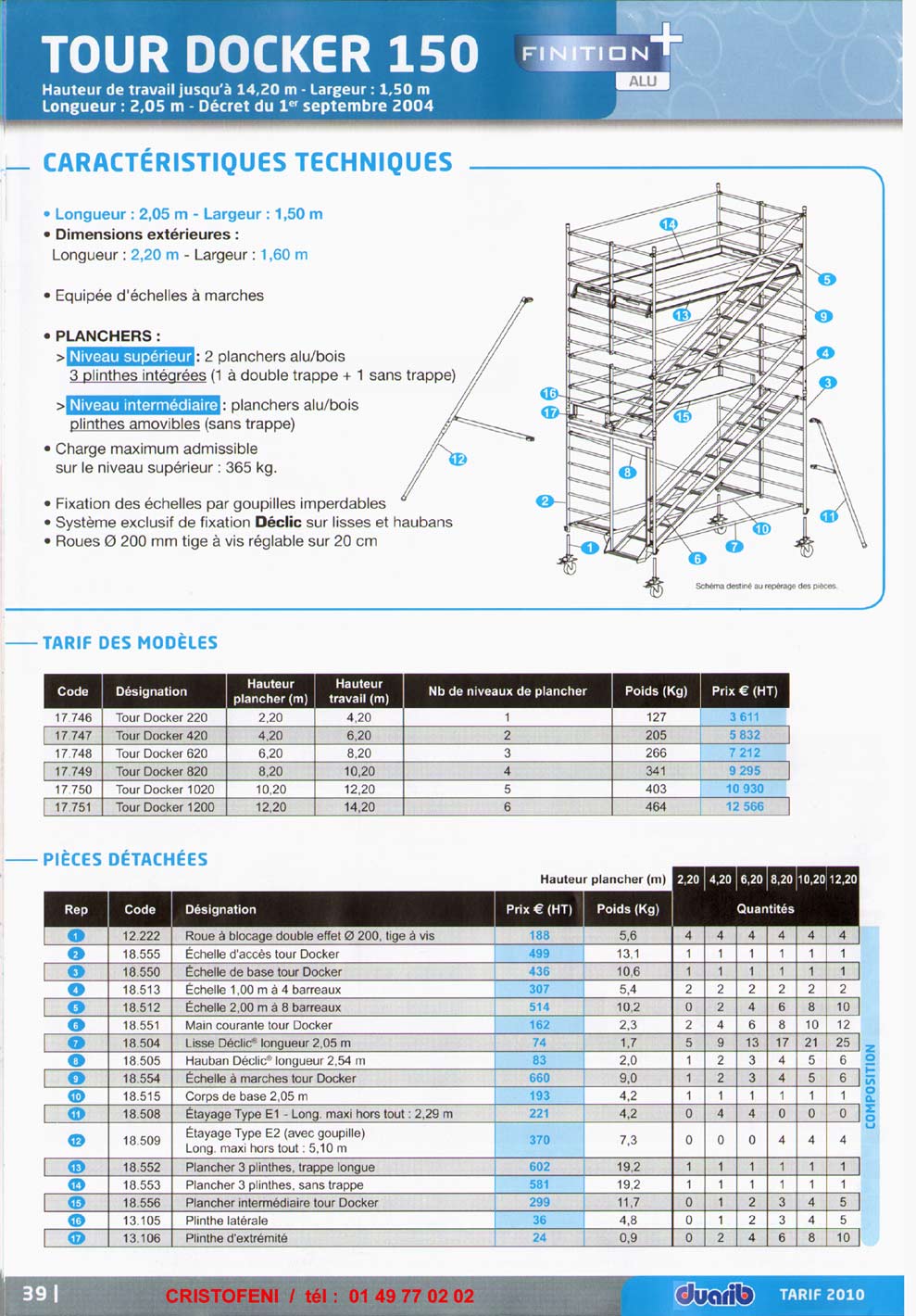 page n° 39 et 40 du catalogue DUARIB , la TOUR DOCKER 150 . d' échafaudages roulants aluminium et acier