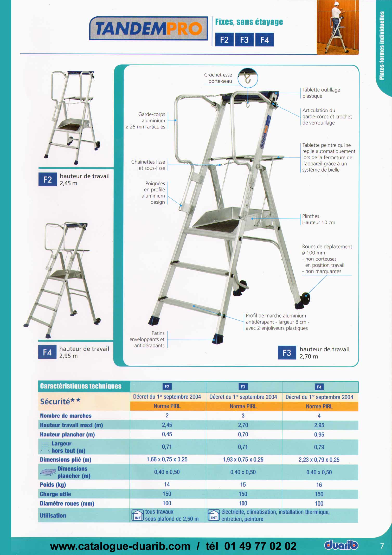 les échafaudages aluminium, échafaudage aluminium Comabi duarib , prix des échafaudages aluminium comabi duarib sont visibles dans le catalogue duarib ainsi que les prix des échafaudages aluminium mais aussi les prix des échafaudages acier pour façade donc pour façadier, pour peintre, pour maçon, pour couvreur, dans toutes les hauteurs. Les échafaudages fixes R200 sont aux nouvelles normes européennes EN12810 et 12811 conforme au décrêt 01/09/2004. Nous vous proposons des échafaudages aluminium starlium idéal pour un travail en façade ou sous plafond, les géréris en acier, hauteur plateau 6 mètre, -6 m, 7 mètres, 7 m, 8 m, 8 mètres, 9 m, 9 mètres, 10 m, 10 mètres, 11 m, 11 metres, 12 métres, 12 m, 13 m, 13 métres, 14 m, 14 mètres, 15 m, 15 mètres, 16 m, 16 mètres, 17 m, 17 mètres, 18 m, 18 mètres. Vous trouverez également des gazelles ou tétris, socles à vis articulé pour départ d'échafaudage, filets de protection, des colliers orientables, amarrges chevilles, amarrage vérins, plancher alu, plancher alu-bois, placher acier. La tour escalier 3 m x 1.50 mètres de large de type solidium, des monte-matérieux pour couvreur, plaquiste, pour maçon à des prix très intéressants.