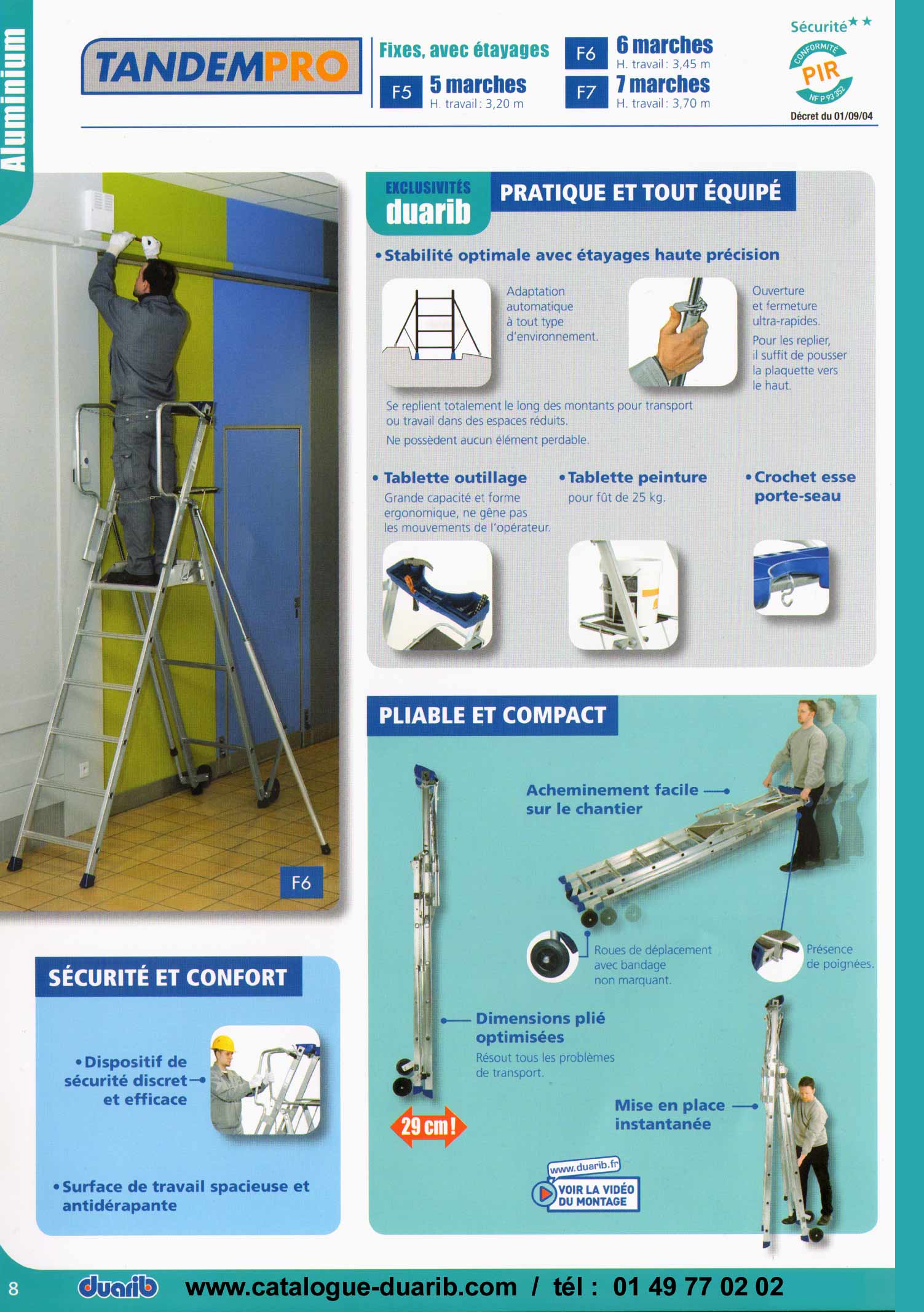 echafaudage fixe, échafaudage sur facade, echafaudage pour macon, echafaudage pour maçons, duarib vous propose des promotions valables jusqu'au 12/09/2008 Des prix, encore des prix pour des lots d' échafaudages de façade R200, des lots d'échafaudages de constructions M49, de couvreur, des lots de planchers aluminium, acier, des lots de filets, d'amarrages chevilles ou vérins.Sans oublier, les échafaudages roulants en aluminium hauteur plateau 6 / travail 8 m, pour le 180, 280, 400, 600, avec escaliers intérieurs. L' échafaudage roulant anodisé, à ne pas rater pour travailler sans avoir les mains sales. Les plates-formes de sécurité sont aussi en promotion, le tétris, le minix, l' hélis, le marchepieds sécurisé aluminium skippy 3 ou 4 marches